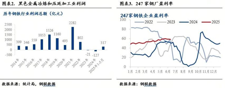 上半年,钢厂利润改善。据国家统计局数据,2025年1-5月,黑色金属冶炼和压延加工业利润总额为316.9亿元,相较于前两年利润情况大大改善(2023年同期亏损21亿元,2024年同期亏损127亿元)。