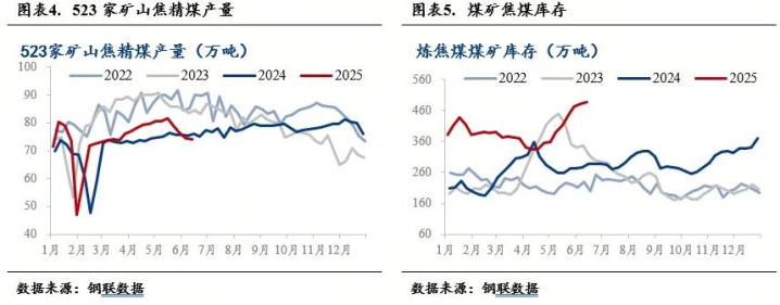 供需严重失衡是焦煤价格下跌的核心原因。2025年1-5月,规模以上工业原煤产量累计为19.9亿吨,同比增长6.0%,其中山西原煤产量为54174.5万吨,同比增长13.6%。上半年,Mysteel调研523家样本矿山国内精煤日均产量约75.05万吨,同比增加5.4%;而国内247家钢厂日均铁水产量为235.9万吨,较2024年上半年增加3.6%,供需差导致焦煤过剩。