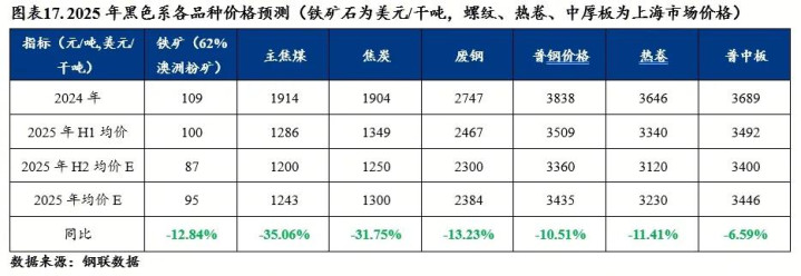 预计2025年下半年3360元/吨,同比下跌7.5%,普钢绝对价格指数全年均价为3435元/吨,同比下跌10.5%。