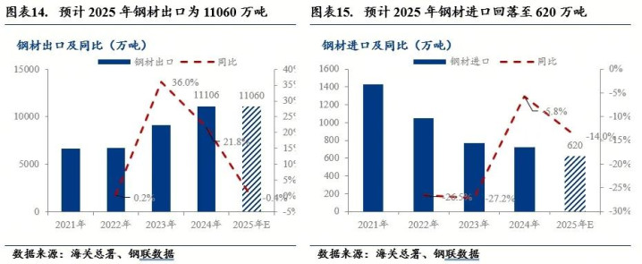 预计2025年下半年中国钢铁出口下降500万吨,预计2025年全年钢材出口11060万吨,同比下降46万吨。