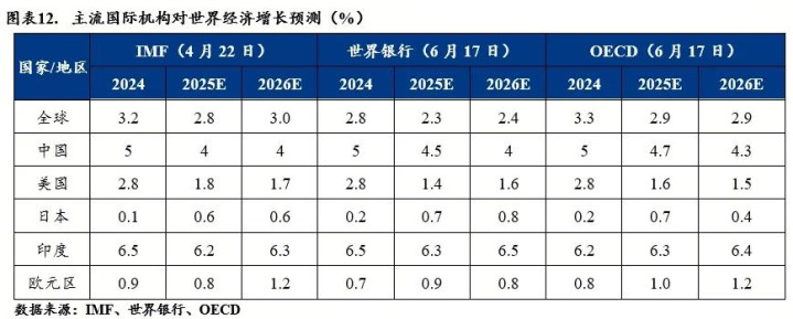 由于全球贸易形势紧张、地缘政治冲突频发,且政策不确定性较高,各大机构调降了2025-2026年全球经济增长的预测。根据最新的预测,预计2025年全球经济增速2.5%左右,其中中国4.5%,美国1.6%,欧元区0.9%,日本0.7%,印度6.3%。