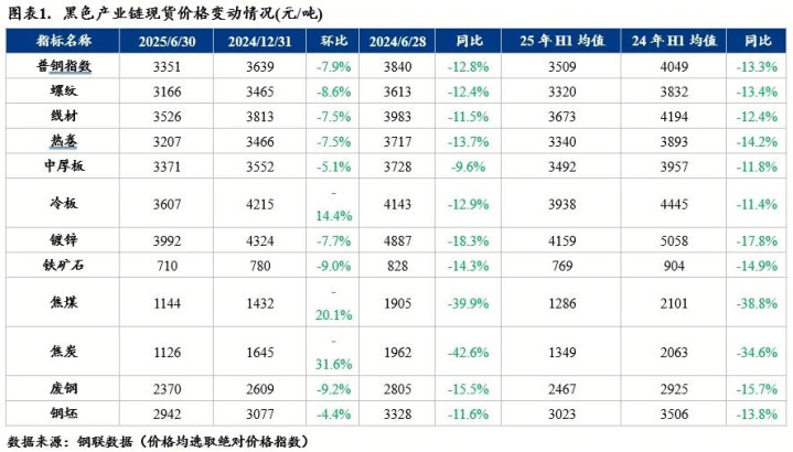 2025年上半年,钢价及原料价格均偏弱运行,原料跌幅大于钢材。双焦领跌,焦煤较年初20.1%,焦炭下跌31.6%,铁矿石下跌9%。钢材品种中,冷轧价格跌幅最大,为14.4%,其次是螺纹钢,跌幅为8.6%,中厚板价格跌幅最小,为5.1%。