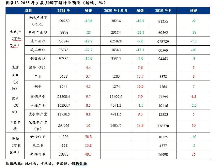 2025年下半年房地产市场持续深度调整,基建投资增速将放缓,但上半年地方政府专项债完成额不足年度的40%,下半年专项债发行速度将加快,建筑业用钢需求降幅将收窄;“两新”政策仍在,但地方补贴退坡现象增多,将抑制终端消费需求,预计下半年制造业用钢增速放缓。预计2025年国内粗钢表观消费预计同比下降0.6%。国内具体下游行业来看: