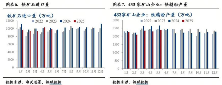 铁矿石供应缩减,价格跌幅较小。进口矿方面,2025年1-5月,中国累计进口铁矿石同比减少2657.2万吨、降幅5.2%。其中,进口澳大利亚铁矿石同比减少1.2%,进口巴西铁矿石同比减少10.0%。内矿方面供应也同样缩减。1-5月332家矿山企业铁精粉累计产量10681.6万吨,同比下降5.4%。