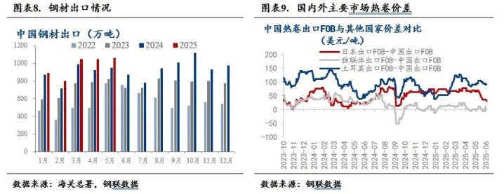 钢材出口继续增加,品种结构出现变化。2025年以来,尽管贸易保护主义频出,但因国际市场需求仍在,以及中国钢材价格优势,中国钢材出口仍然保持增长。2025年1-5月,全国出口钢材4846.9万吨,同比增长8.9%。钢材出口品种出现分化,热卷和冷轧受关税影响,分别同比下降21.8%和2.8%,而钢坯出口471万吨,同比增加305%。