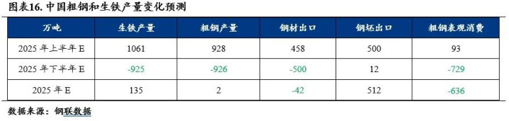 预计2025年下半年粗钢和生铁产量同比均有回落预期。2025年上半年国内钢铁消费趋稳,在钢铁出口增加背景下,国内钢铁产量整体呈现增加态势,上半年粗钢产量同比增加928万吨。